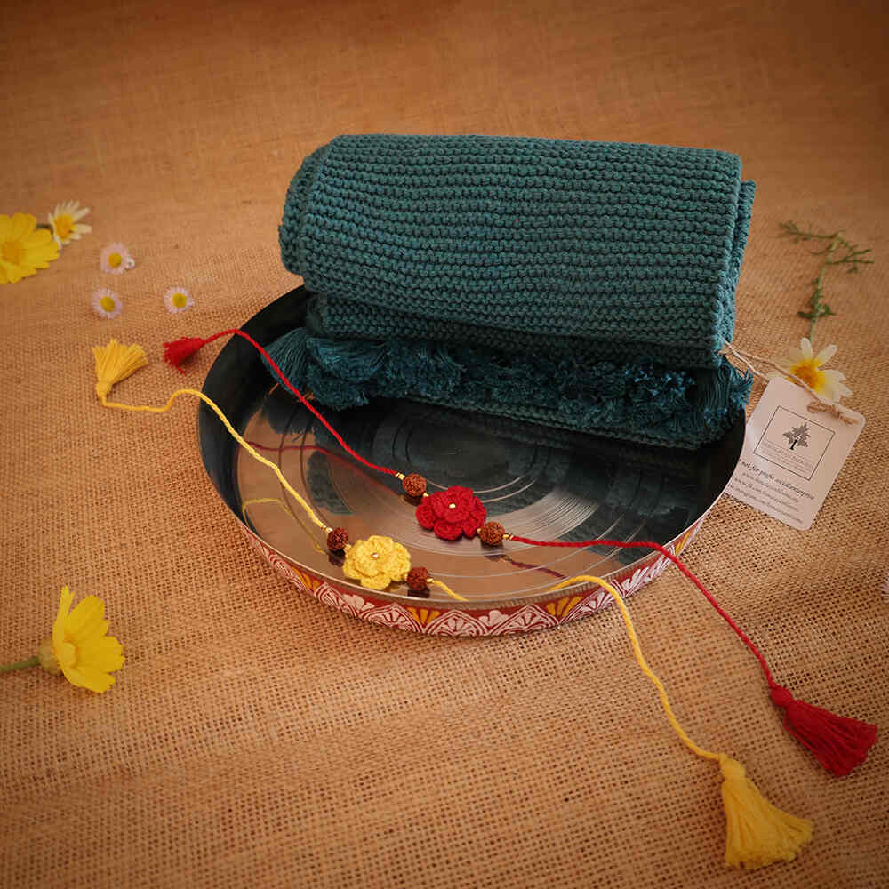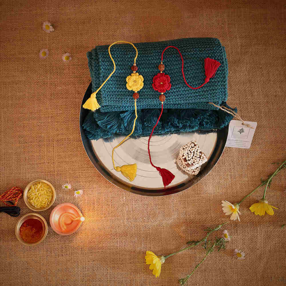 Gift: The hand-knitted scarf is 180*19 cms made of azo-free dyed cotton Rakhi: One size, made with 100% Cotton and Skin-friendly materials.