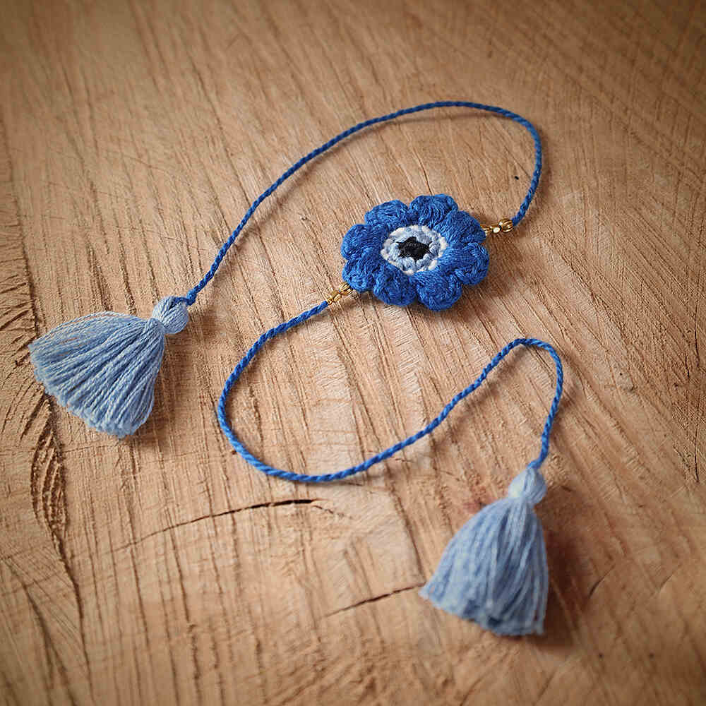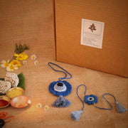 This giftbox listing includes one Evil Eye Rakhi, one Evil Eye bunting (gift/accessory), with rauli (yellow and red taaga, black taaga), chawal( Uttarakhand special haldi, homemade kumkum and akshat), copper diya and sweets